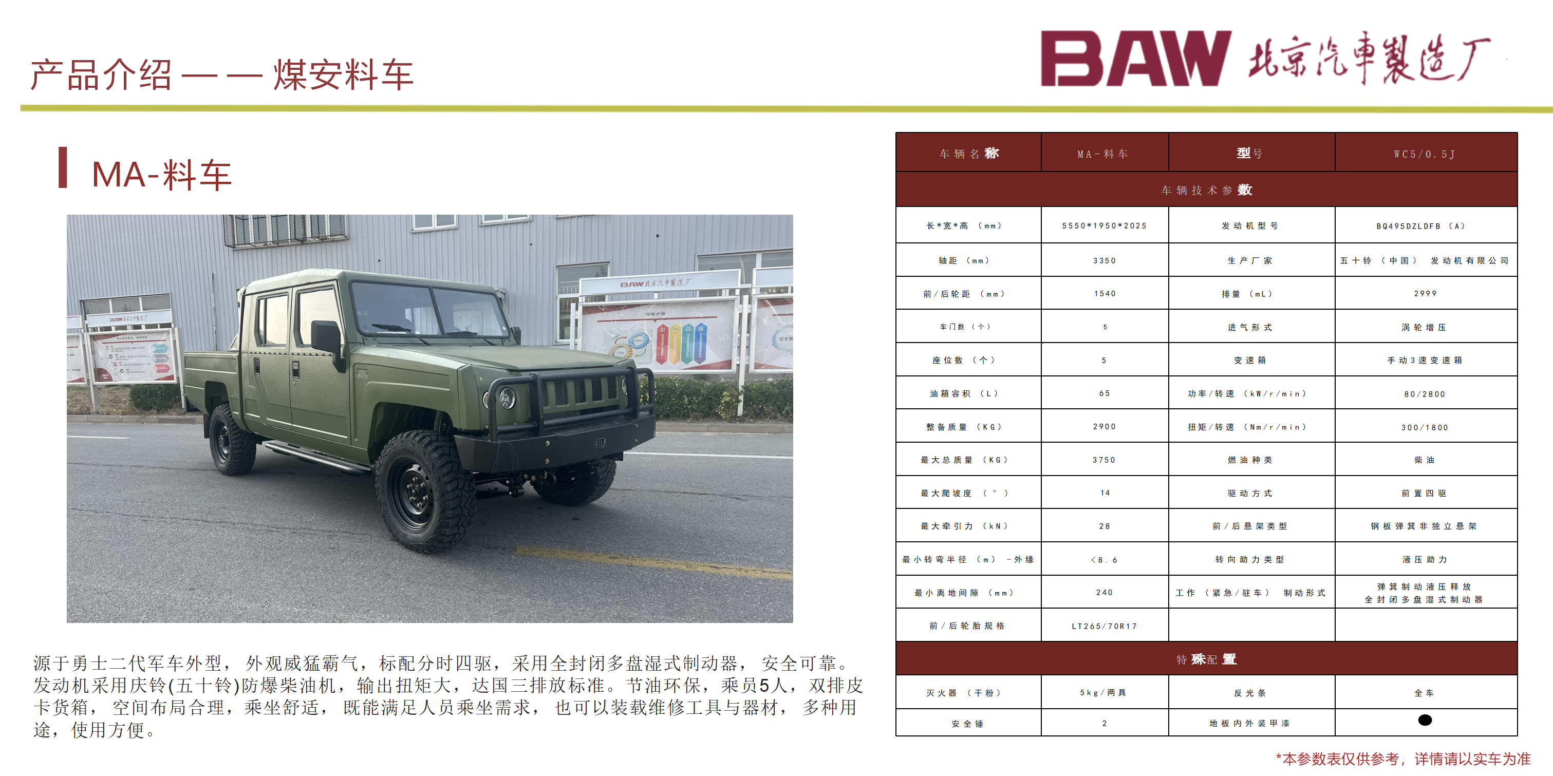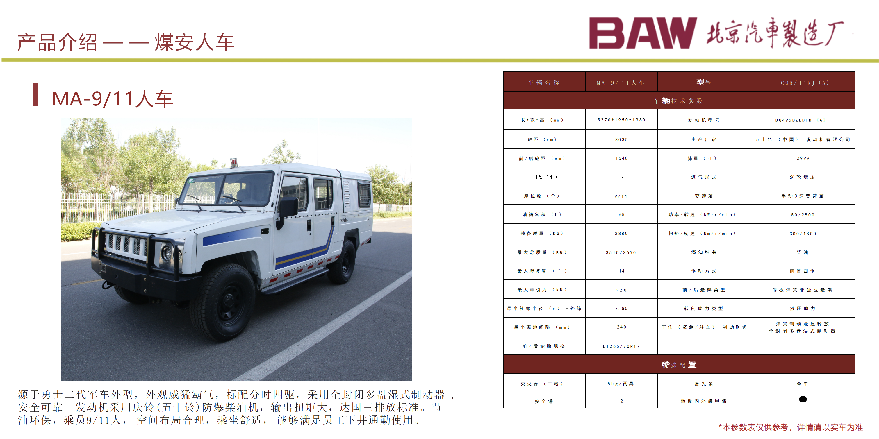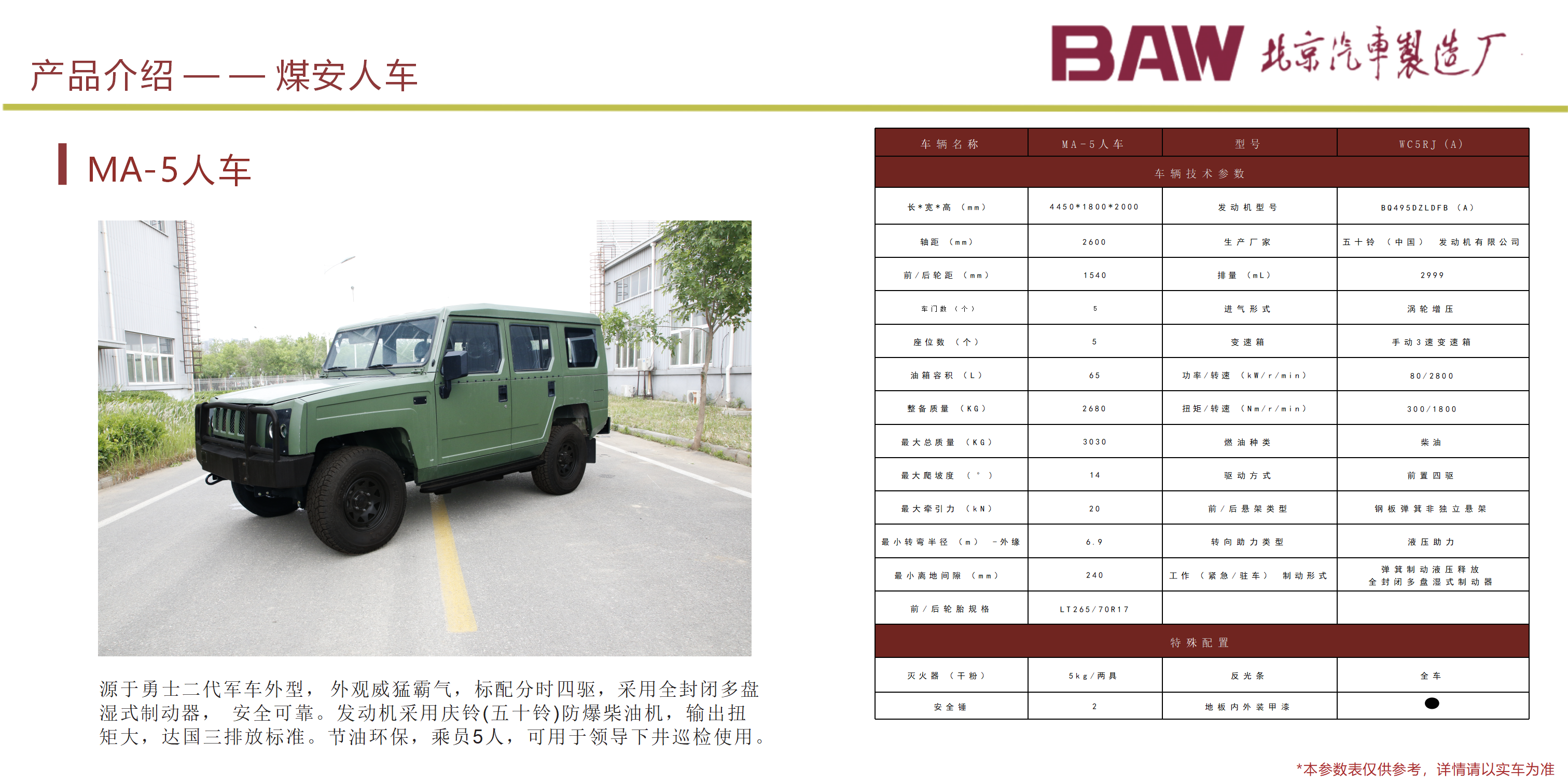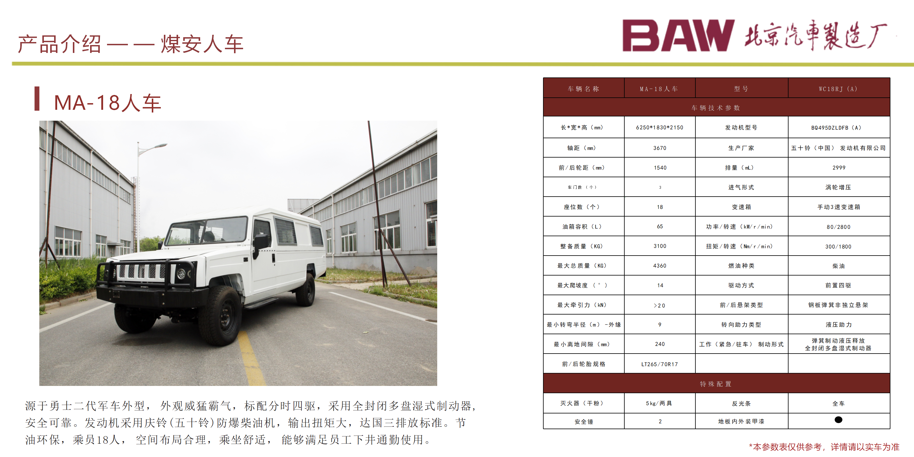 煤安車系列源于勇士二代軍車外型, 外觀威猛霸氣,標配分時四驅(qū),采用全封閉多盤濕式制動器, 安全可靠。發(fā)動機采用慶鈴(五十鈴)防爆柴油機,輸出扭矩大,達國三排放標準。節(jié)油環(huán)保, 空間布局合理,乘坐舒適, 能夠滿足員工下井通勤使用。